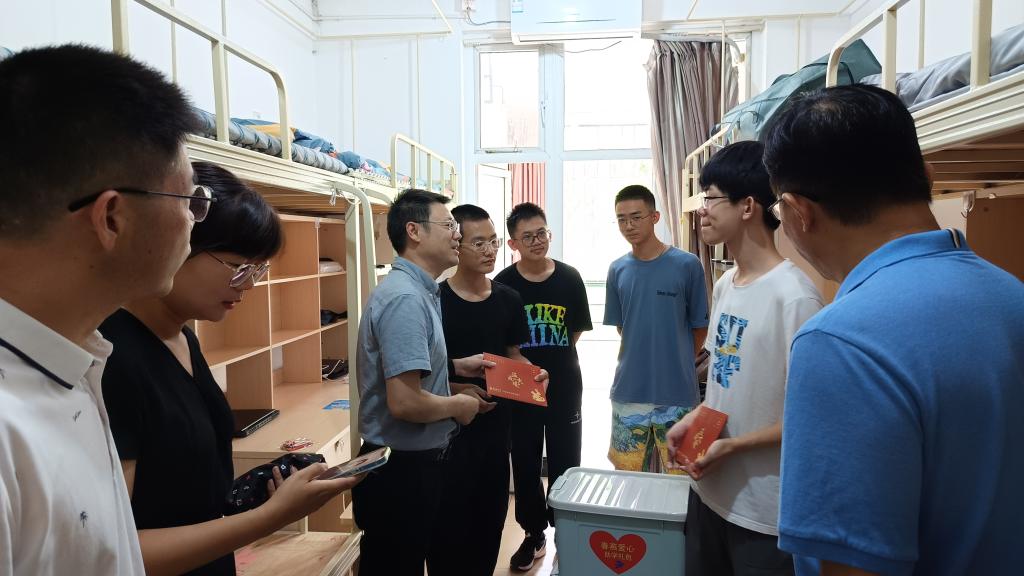 随后,学院领导班子在辅导员和新生班主任陪同下深入学院迎新服务点详细了解新生报到流程、志愿服务等工作进展情况,共同前往新生宿舍看望新生。党委书记黄进与新同学们亲切交流,仔细询问入校感受,鼓励初次离家住校的小萌新勇于突破,锻炼自我,尽快适应校园生活。院长陈小平亲自为家庭经济困难的新生送上慰问大礼包,勉励他们砥砺奋进、不负韶华。