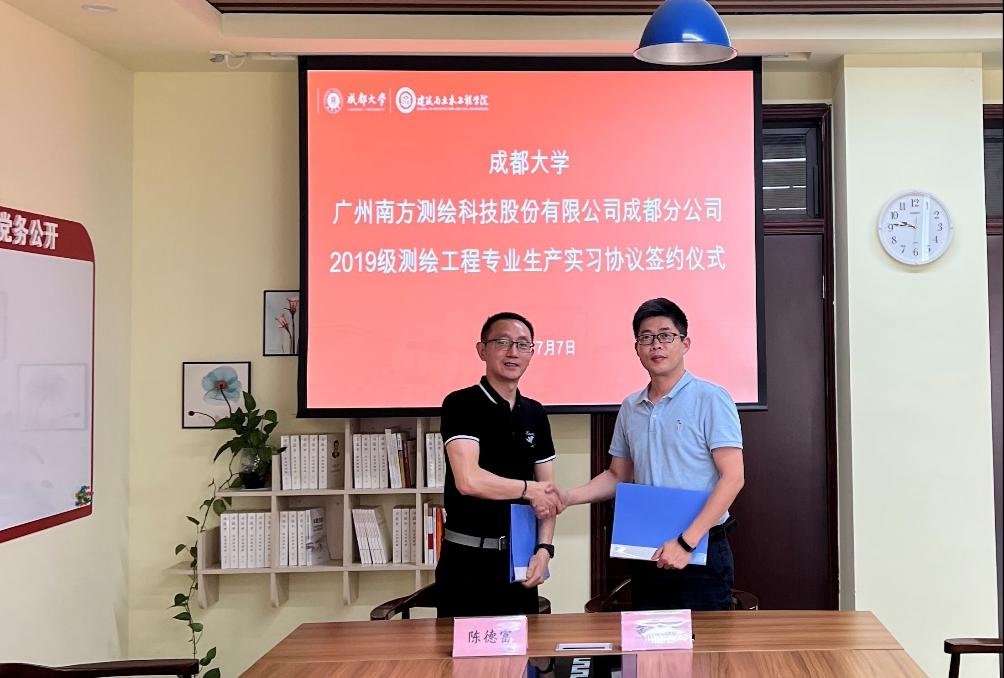 219党员活动室,学院副院长董建辉、广州南方测绘科技股份有限公司成都分公司(以下简称“南方测绘”)总经陈德富分别代表校企双方共同签订了2019级测绘工程专业暑期生产实习协议。学院副院长王静、教务办及测绘工程系实习带队教师代表熊容、韩丽丽、李丽等共同出席了签约仪式。