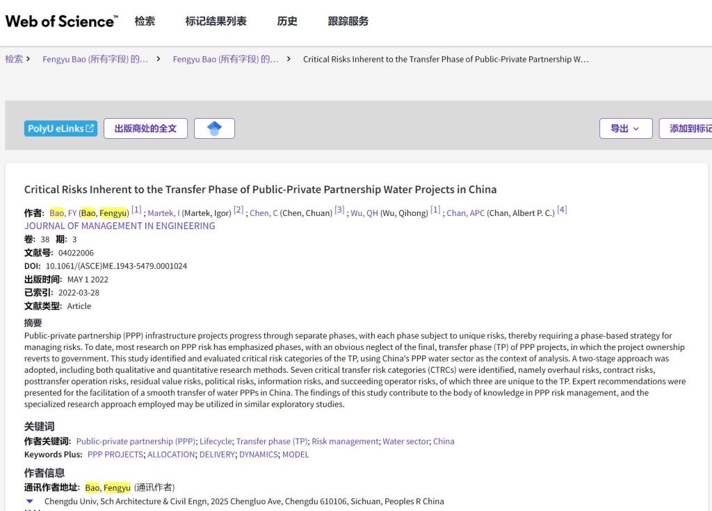 工程管理系包烽余博士以第一作者、成都大学为第一单位在工程管理领域国际顶级期刊《Journal of Management in Engineering》(中科院一区,IF=6.853)上发表了题为“Critical Risks Inherent to the Transfer Phase of Public-Private Partnership Water Projects in China”的最新研究成果。
