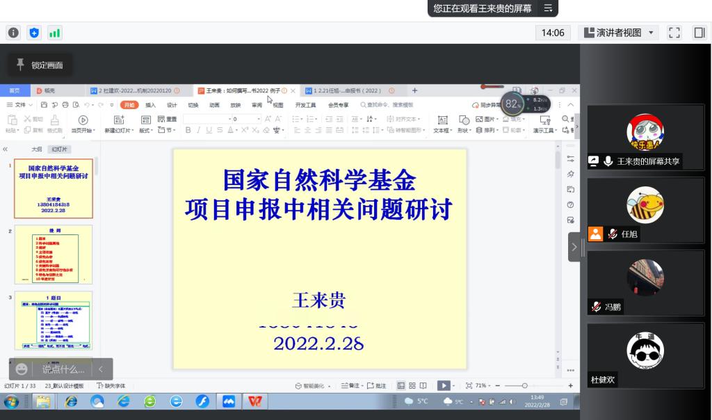 王来贵教授以“国家自然科学基金项目申报中相关问题研讨”为主题,对学院教师撰写的自然科学基金项目申报书(初稿)存在的问题进行了剖析,针对科学问题的提炼、申请书的题目、摘要、关键词、立项依据、研究内容等部分的写作规范进行了详细阐述,就具体问题提出了改进思路。参会教师也结合自身疑惑积极发言,进行了热烈的交流和探讨。