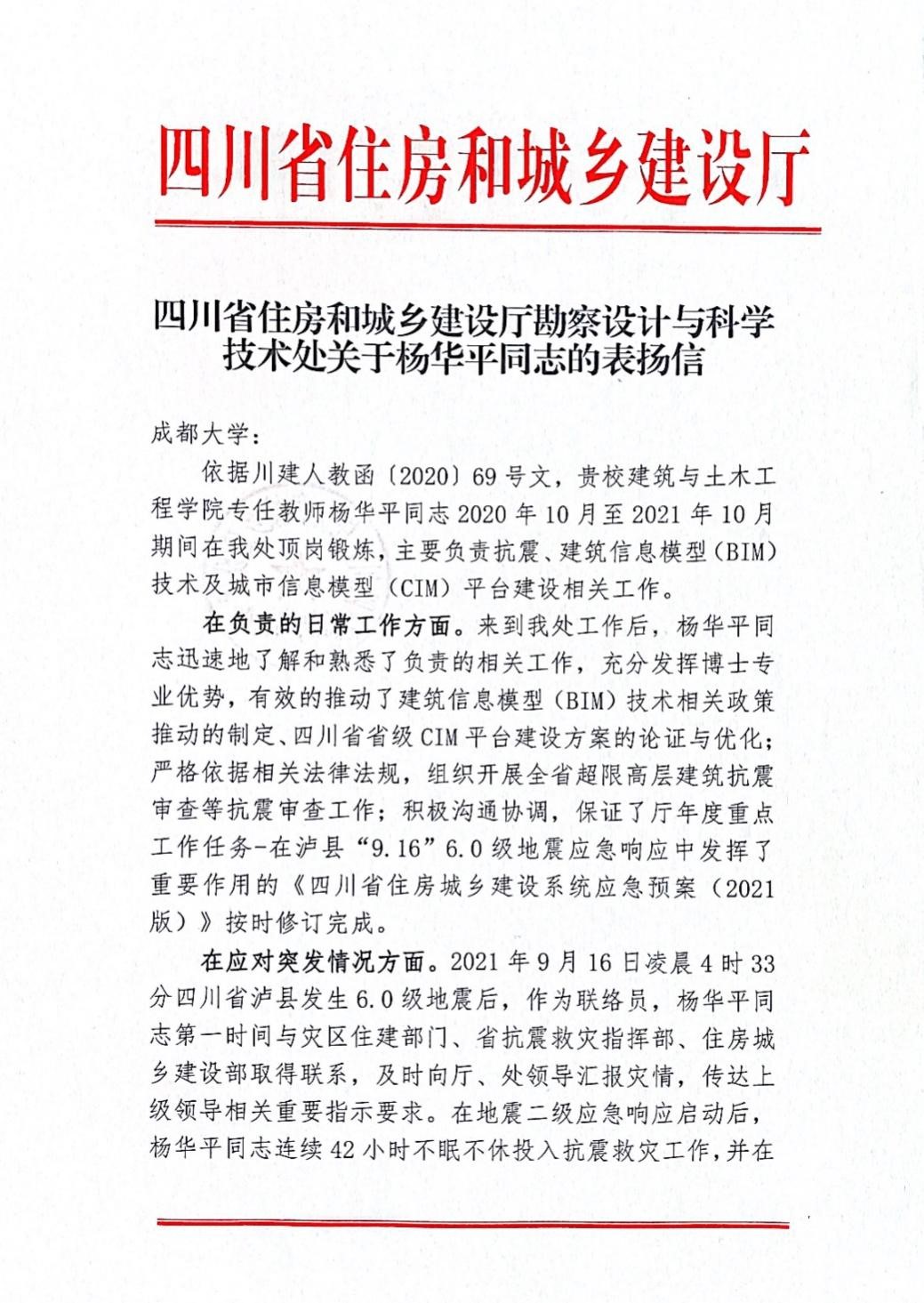 专任教师杨华平博士于2020年10月至2021年10月期间前往四川省住房和城乡建设厅挂职锻炼。