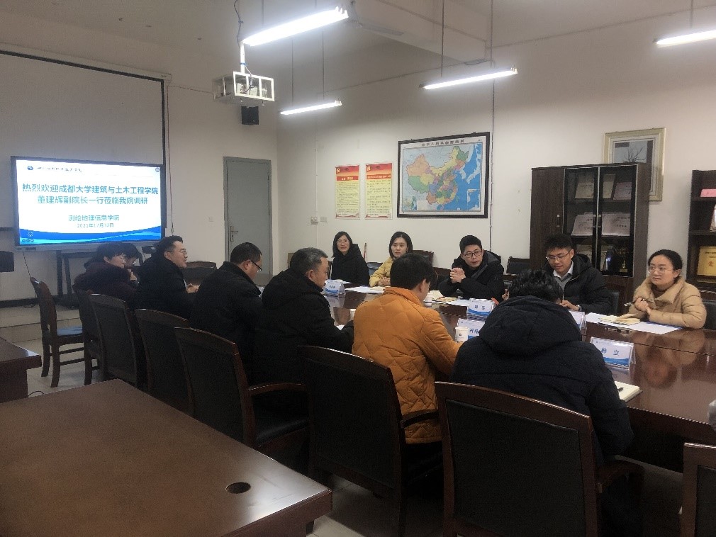 2021年12月30日,学院董建辉副院长带领测绘工程系骨干教师代表赴四川水利职业技术学院测绘地理信息学院(以下简称“测绘学院”)就产学研协同育人模式进行专项调研,重点在测绘学院负责人的陪同下参观了测绘学院实验室和实践平台。四川水利职业技术学院副校长张智涌、测绘地理信息学院党总支书记汪仁银、院长陈锐以及学院相关教师出席了本次调研交流。