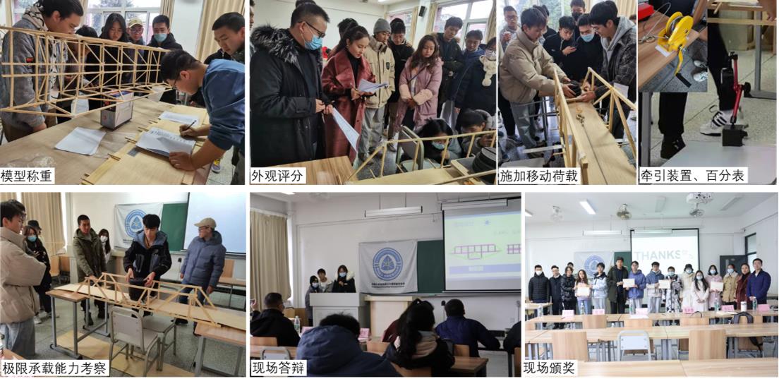 赛事过程分为设计创意及制作质量考察(10%)、移动荷载加载(60%,要求挠度不超过2.0 mm)、极限承载能力考察(20%,破坏加载)及现场答辩(10%)、颁奖、总结等环节,主办方对整个赛事过程也进行了直播。