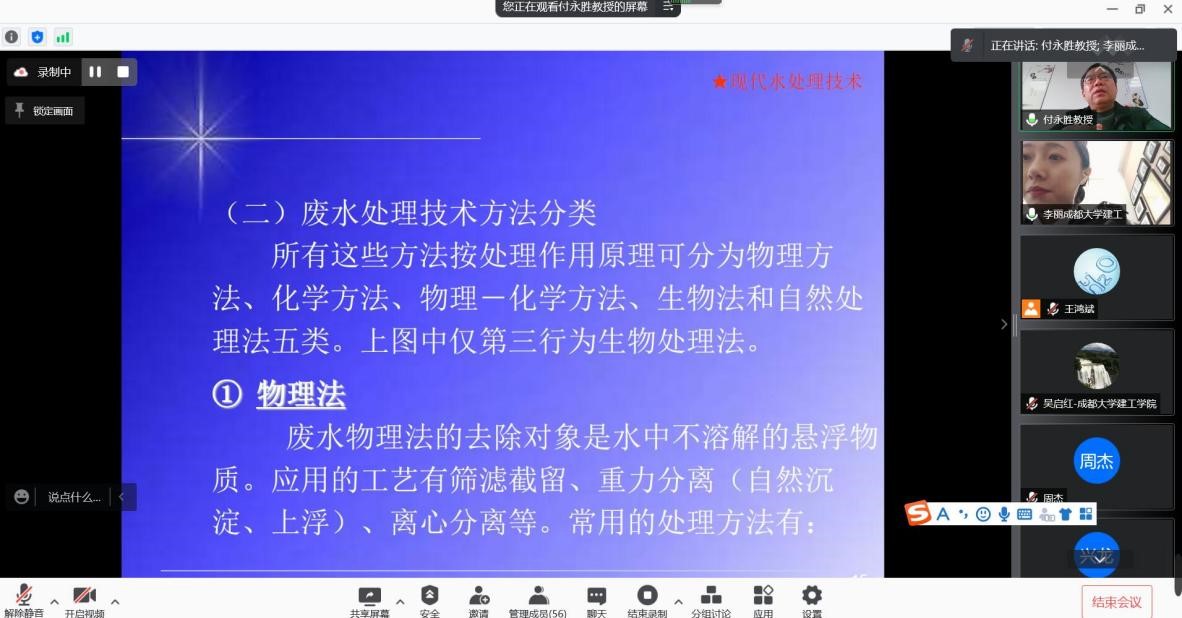本次讲座邀请了西南交通大学原环境科学与工程学院院长付永胜教授(博士生导师),以腾讯视频会议形式开展,讲座主题为《水污染及治理》。会议由环工系教师王鸿斌主持,各年级优秀学生参加。