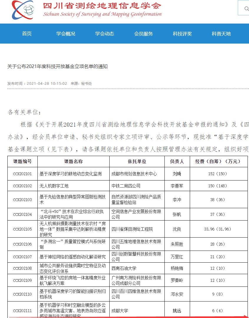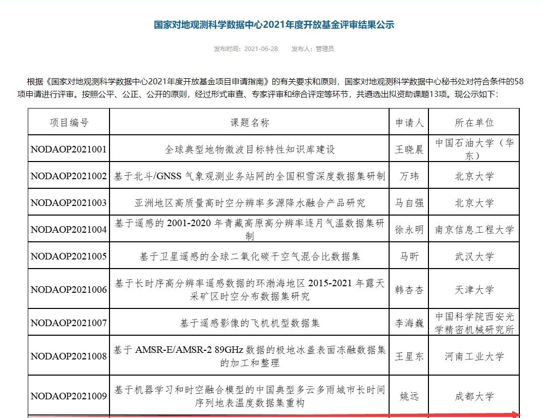 测绘工程系姚远博士申报的“基于机器学习和时空融合模型的中国典型多云多雨城市长时间序列地表温度数据集重构”、“基于深度学习和数值模拟的城市高密度街区建筑能耗调控研究”、“基于机器学习和时空融合模型的多云雨城市高温灾害、地表热岛效应遥感监测与生态调控研究”等3个课题,分别获得国家对地观测科学数据中心开放基金(省部级)、人工智能四川省重点实验室开放基金(厅局级)、四川省测绘地理信息学会科技开放基金等3家单位资助。