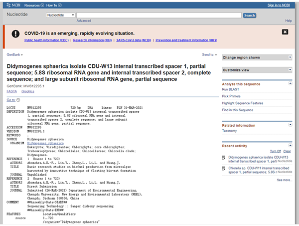 2019级环境工程专业学生组成的“知学”科创小组,在Abomohra(马文标)教授指导下,从校园里分离到一些纯净的微藻菌株,通过培育、分离和鉴定,获得微藻CDU-W13和CDU-W11的DNA测序结果,该结果于2021年3月以成都大学为单位被世界基因库(Gen Bank)收录,相关链接如下,序列登录号分别为MW812295.1以及MW817150.1。这是按摩无码