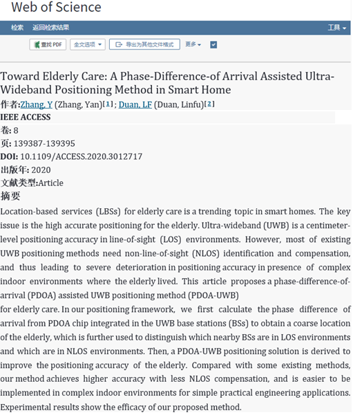 建筑系张妍老师以第一作者在工程领域国际期刊《IEEE Access》(中科院二区期刊,影响影子3.745)上发表一篇题为“Toward Elderly Care: A Phase-Difference-of-Arrival Assisted Ultra-Wideband Positioning Method in Smart Home”的最新研究成果。