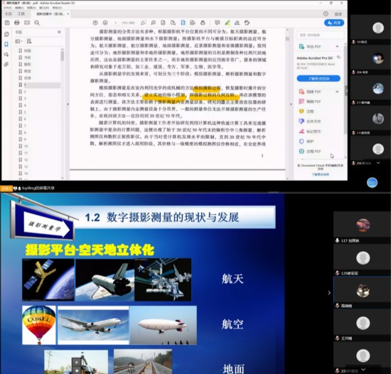 2月28日上午,鲁老师提前30分钟进入“腾讯会议”直播间并发布“超星学习通”签到。教学过程中,通过“腾讯会议”对教材和PPT进行屏幕分享,适时提问和互动讨论,结合“超星学习通”平台开展章节测验,鲁老师对课程内容和进度掌握合理。通过课程PPT讲授、精品课程和MOOC课程视频分享和集中答疑讨论,学生对摄影测量学中的两个基本关系(几何关系和对应性关系)及当前摄影测量发展的新技术、新形势有了更深的理解,课程学习兴趣有所提高。