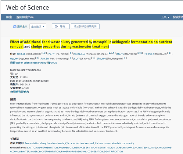 今年,环境工程系特聘副研究员唐嘉陵博士以第一作者及成都大学第一单位在工程技术领域顶级期刊《Bioresource Technology》(中科院一区期刊,影响因子6.669)上发表题为“Effect of additional food waste slurry generated by mesophilic acidogenic fermentation on nutrient removal and sludge properties during wastewater treatment”的最新研究成果。