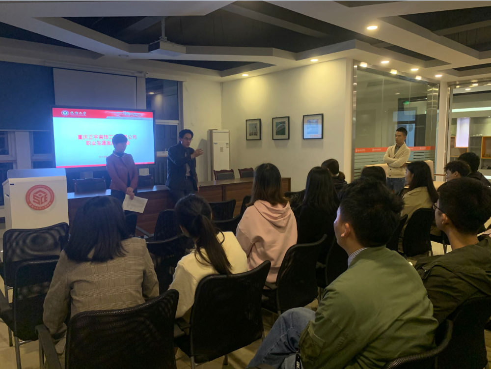 首先,重庆正宇装饰工程有限公司严总为同学们介绍公司概况并结合自身职业发展做分享,让同学们了解到努力进取的工作态度是企业用人首要标准,其次提醒同学们在校期间要加强专业技能学习和沟通交流能力。