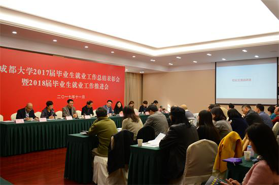 (文/陈佳美)2017年11月14日上午,成都大学2017届毕业生就业工作总结表彰会暨2018届毕业生就业工作推进会在学生活动中心101会议室举行,校党委书记罗波、校长王清远、副校长唐毅谦出席会议,会议由副校长彭晓琳主持。就业工作领导小组成员单位负责人、各学院院长、书记、副书记、就业工作辅导员、2018届毕业班班主任参加会议。