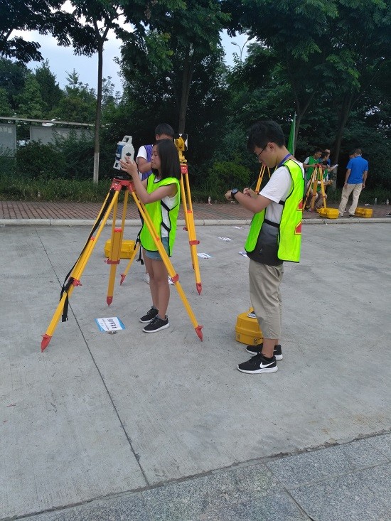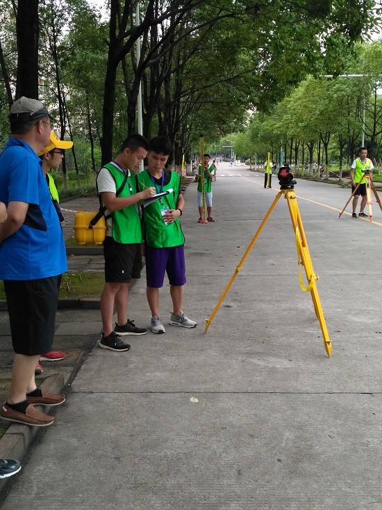 派出了3支队伍共16名同学参赛,其中专业组2支队伍(由测绘专业学生组成,其中专业1队李卫东、朱正伦、刘佳、魏朋志、张涌、李二妹;专业2队赵程鸿、高先明、方超、郭怀伦、张思睿、王粒梦)参加二等水准测量、一级导线测量、1:500数字化测图、地形图数据建库和三维激光点云建模五个单项奖的竞争,非专业组1支队伍(由工程管理专业和工程造价专业学生组成,向元芝、陈仕真、陈俊武、邵帅)参加四等水准测量、二级导线测量两个单项奖的竞争。