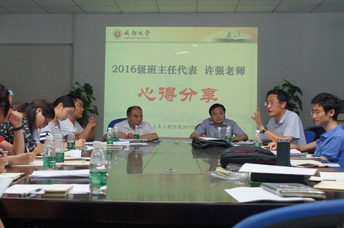 2016级班主任代表许强老师就自己从教26年、担任班主任多年的心得与与会老师进行分享。许老师总结,回顾过去的班主任工作经历,面对学生,要带着爱与宽容,根据不同时期学生不同特点做好学生的引导工作,要注重学生的安全与健康,要培养学生的责任心和底线意识,并就班级内部班委组织构建、引导班级学生制定班规、深入寝室开展学生思想政治教育工作、如何与学生做朋友等方面展开介绍了自己过去工作的经验与方法。
