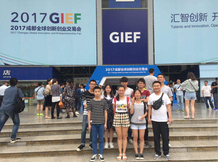 几位同学在李烽老师的带领下和学校其他学院同学一同乘车前往了成都国际会展中心,参观了“2017成都全球创新创业交易会”。