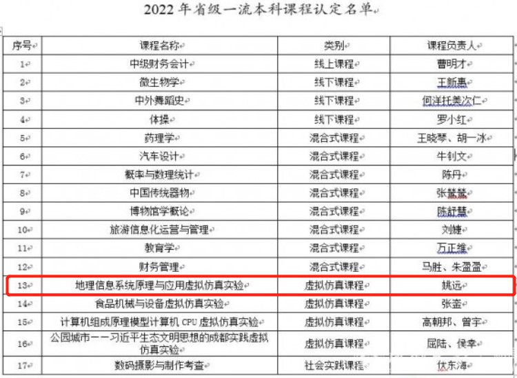 姚远老师申报的《地理信息系统原理与应用虚拟仿真实验》获批2022年四川省虚拟仿真类一流本科课程。